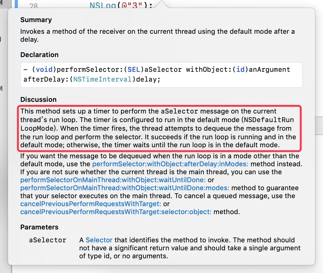 还有一个方法是- (void)performSelector:(SEL)aSelector withObject:(nullable id)anArgument afterDelay:(NSTimeInterval)delay inModes:(NSArray<NSRunLoopMode> *)modes;这个方法多了一个设置mode的参数,可以通过这个参数设置在timer在哪个mode下执行,读者可自己检测。