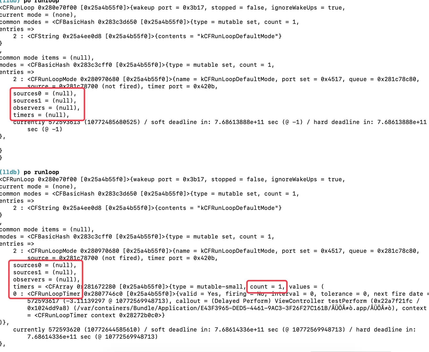 通过获取当前的runloop,系统就会返回当前的runloop,如果没有的话,会创建后返回,但是加入了runloop的时候,执行结果,依然是只有打印出来1和3,没有打印2。在[self performSelector:@selector(testPerform) withObject:nil afterDelay:0]方法调用前后,通过控制台打印runloop对象,确实看到了调用方法后,runloop里多了一个timer源。