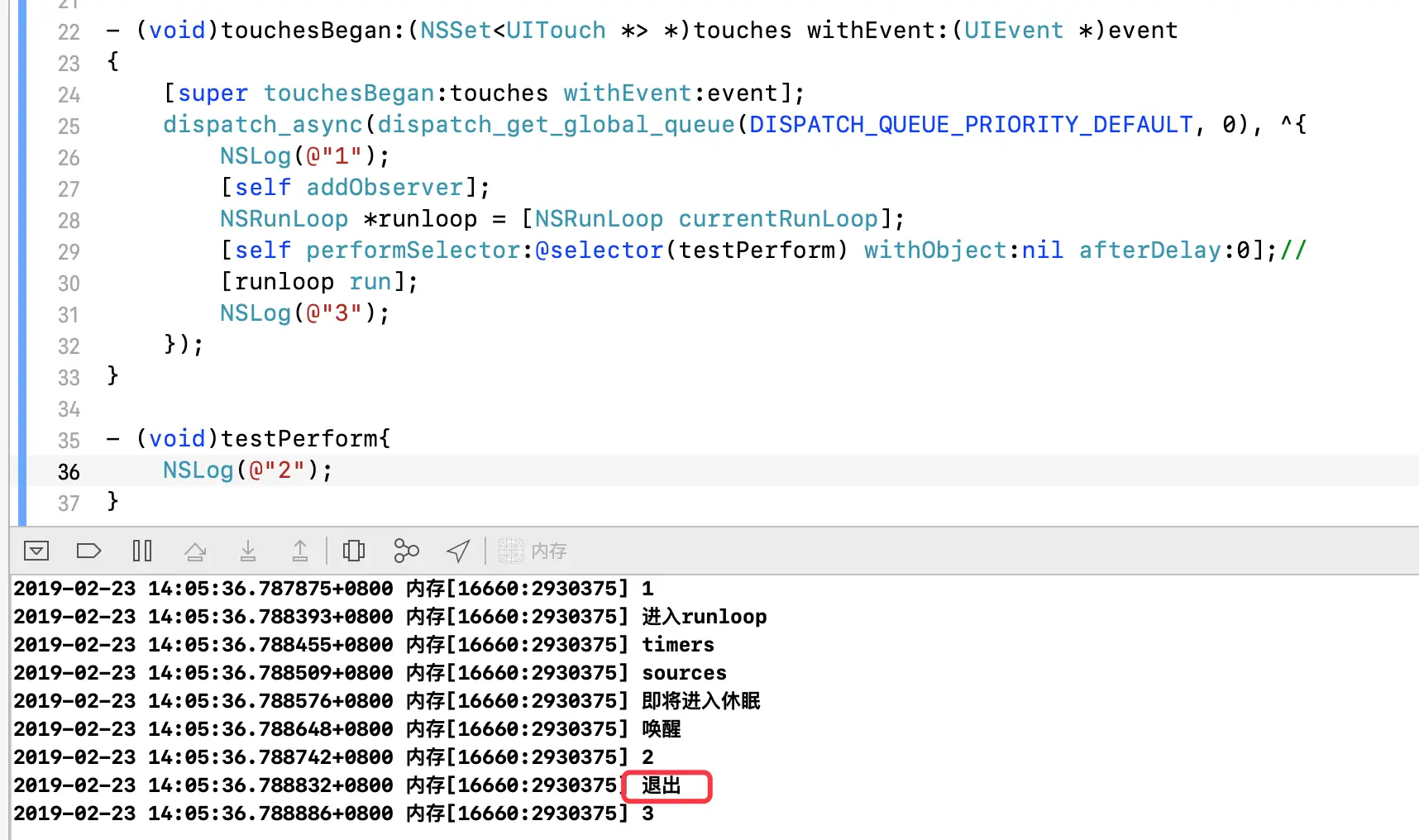 但,问题又来了,既然加入了runloop,并且跑起来了,为什么3还会打印出来,runloop不是相当于死循环吗?循环外的3为什么会打印出来?这个问题,通过加入的runloop的观察者的打印情况可以看出来,是因为,runloop在执行完testPerform后,就退出了。所以下边的3页打印出来了。