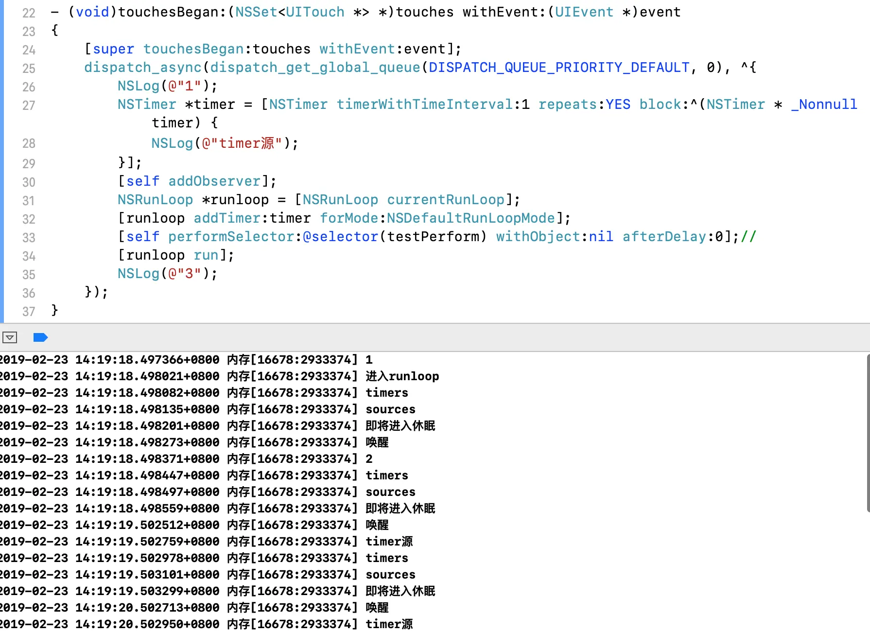 testPerform方法内打印runloop,看到此时runloop对象的timers数组里边已经是空的了。runloop的mode里没有source1、没有source0、也没有timer源,所以就退出了】由此,也可以猜测:在runloop里设置的timer触发[self performSelector:@selector(testPerform) withObject:nil afterDelay:0]方法后,该timer就销毁了。
