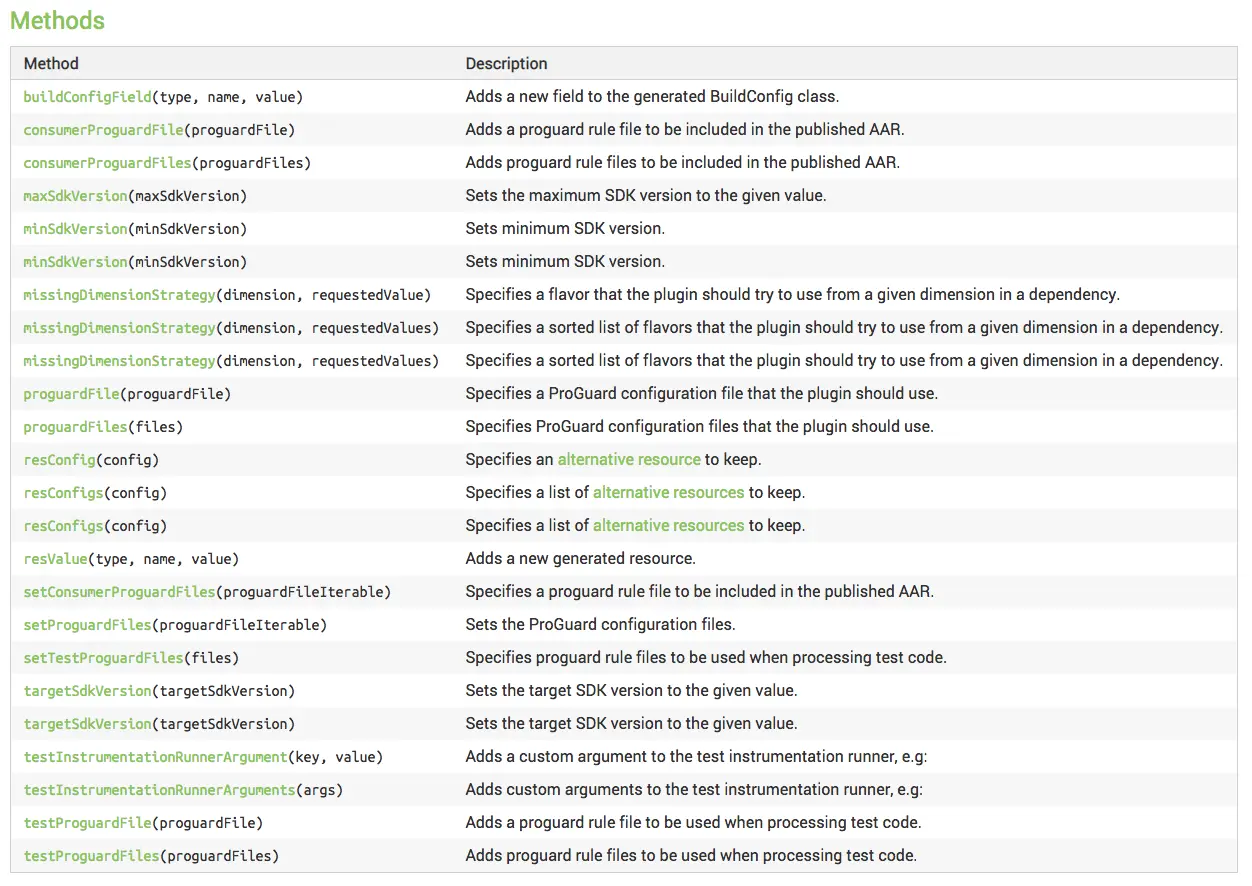 但无论是属性还是方法,一般在build.gradle中配置defaultConfig{}时,一般都是采用形如 key value形式,当然,实际上也可以采用对应的方法原型形式配置,效果是等价的,不过有个前提是,此方法原型是确实存在的,否则,Gradle会报错。