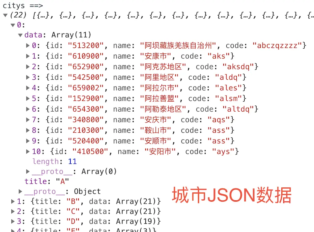 首先看页面布局,全国城市列表的数据自己查找一份,数据格式自己处理了一遍,大概是这个格式。之所以转化成这样是因为第一版用SectionList的数据源必须是这种格式,包含key和data(必须是这个名字)