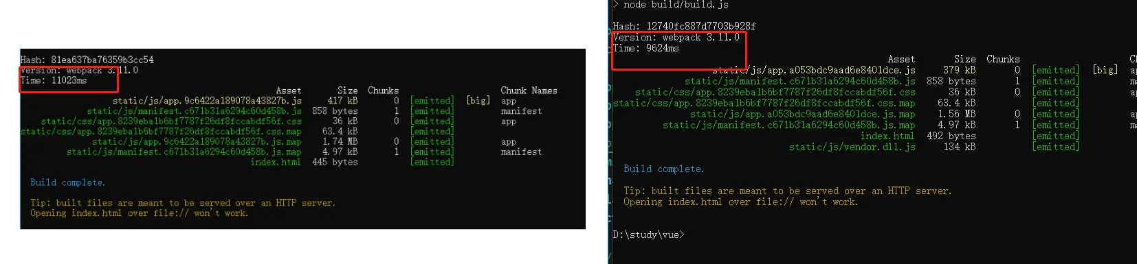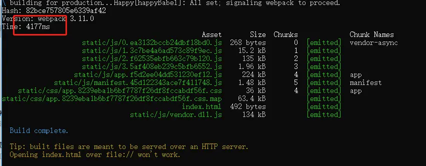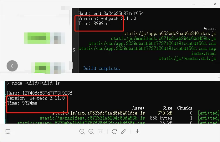 先上图:最终打包速度从11s多优化到了4.177s,二次打包后提升到了3s多