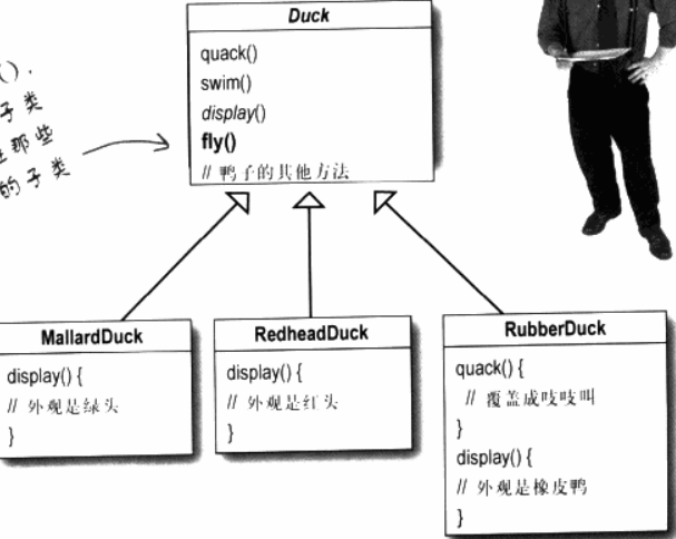 }每次有新的鸭子的子类出现,他就要被迫检查并可能需要覆盖掉fly()和quack() ,这简直是无穷无尽的噩梦。。。