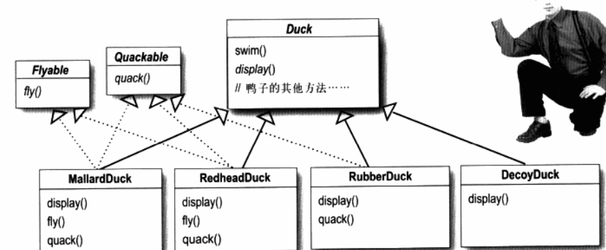 有一个想法: 把fly()从超类中取出来,这么一来,只有会飞的鸭子实现flyable接口,同样的方法可以用在quack(),设计一个quackable接口