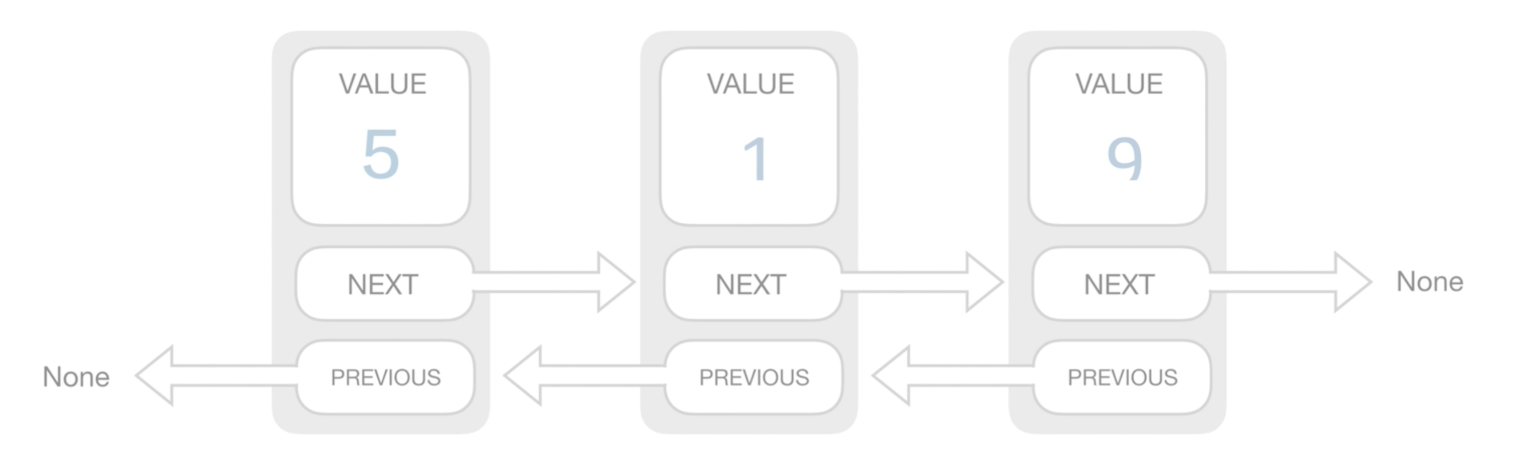 简单介绍一个双向链表,与上面单链表不同的是,双向链表既有前置节点,也有后置节点。