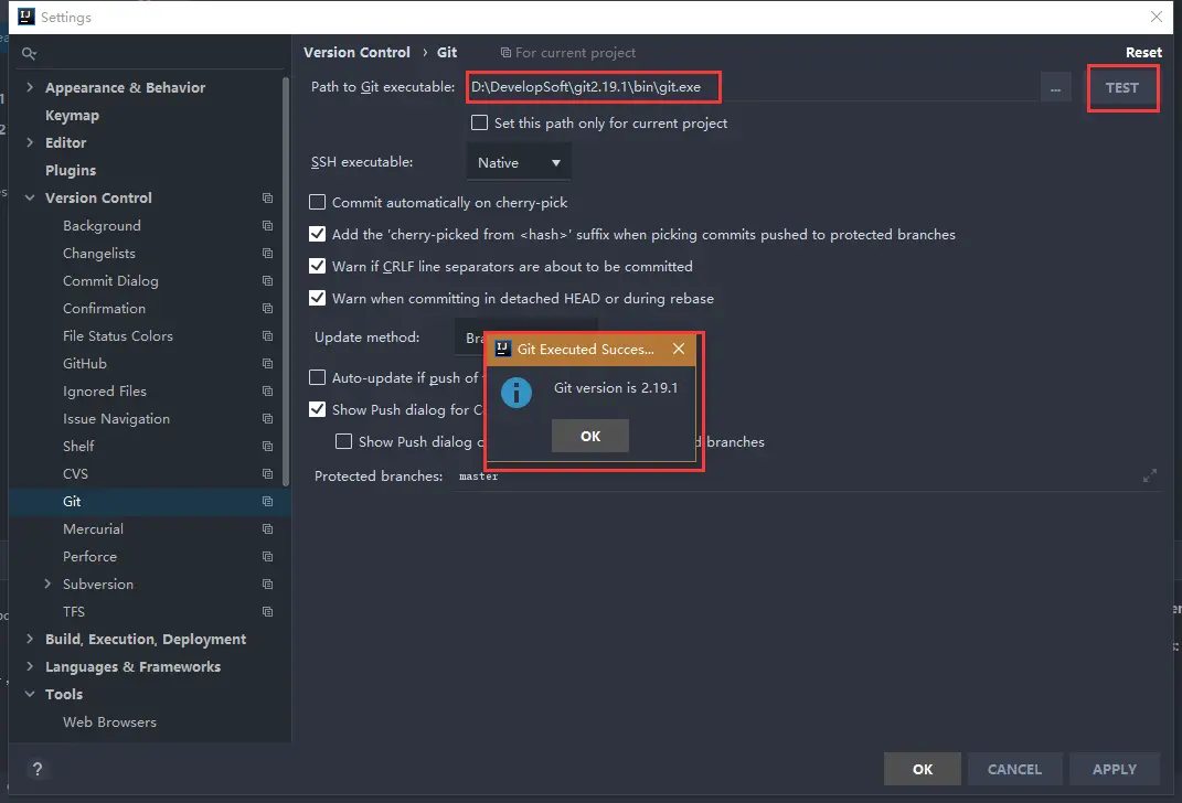 打开IDEA中setting设置选项, File->Settings->Version Control->Git, 配置git.exe路径(Git安装目录\bin\git.exe),然后点击测试