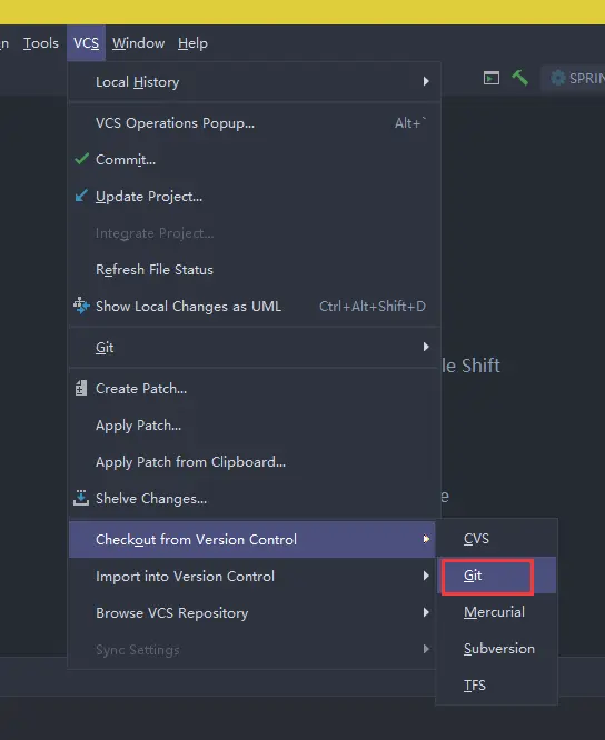 从GitHub中检出任意项目 选择菜单VCS —> Checkout from Version Control —> Git