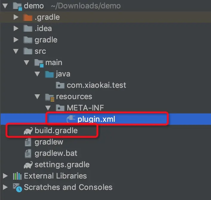 Gradle 依赖解析完成之后,项目结构如下图,其中 plugin.xml 是插件的配置,build.gradle 是项目依赖的配置(类比 pom.xml)。