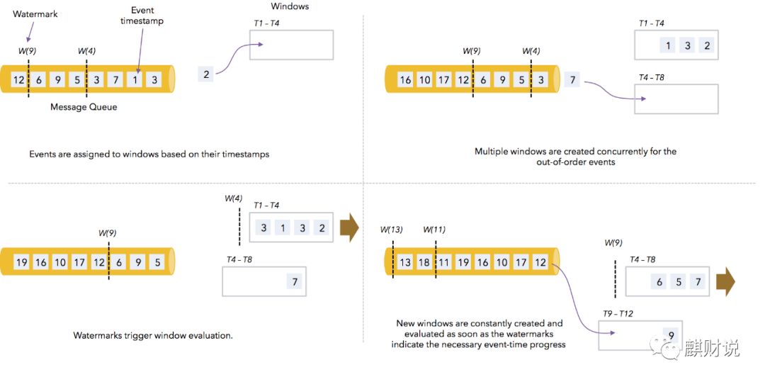 这是一个典型的单通道的场景,首先我们有一个时间事件队列{2,3,1,7,3,5,9,6,12} ,两个wartermark(W4,W9)事件通过时间戳被指派给了窗口(T1-T4)。