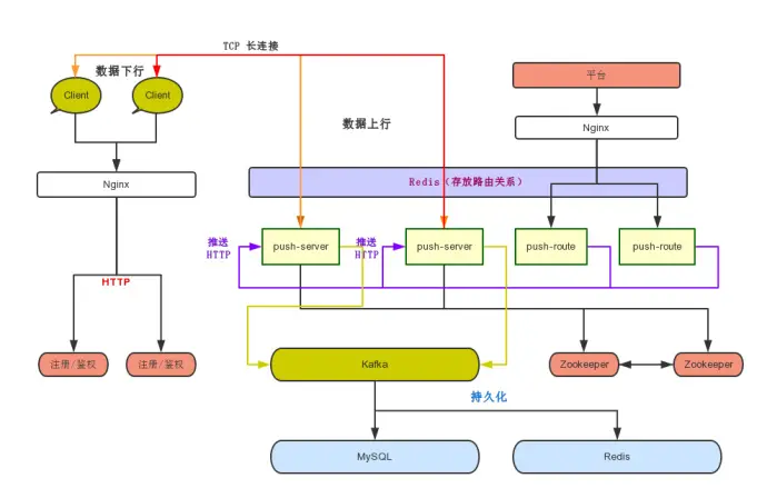 推送消息则需要经过一个推送路由(push-server)找到真正的推送节点。