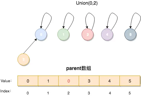 Union(a,b)会将a所在的集合与b所在的集合相结合。在数据结构的实现上,只需要将b的根结点指向a的根结点,或a的根结点指向b的根结点即可,本文中默认使用前者。假设我们现在要将0,2,4合并为一个集合,1,3 合并为一个集合,5单独视为一个集合,那么运算的过程的可能如下: