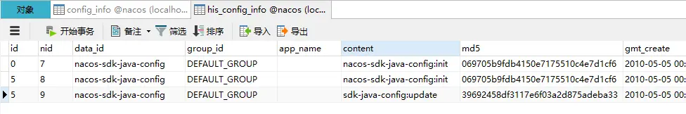启动成功后,我们使用上一篇博客:《Nacos系列:Nacos的Java SDK使用》的案例来验证,运行NacosConfig,观察数据表的内容变化,示例知行后,config_info表和his_config_info表都会有和配置相关的数据,如下图所示: