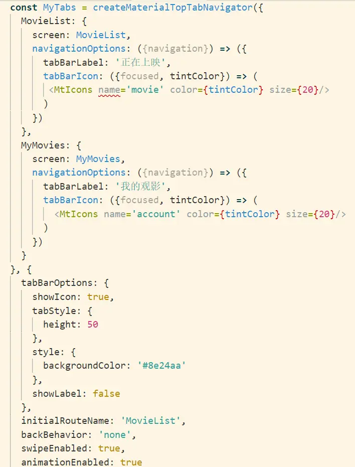 第二个参数可以看成是对tab的全局配置,包括初始路由(initialRouteName),是否点击返回到初始tab(backBehavior,默认为initialRouteName设置的初始页面),是否开启动画(swipeEnabled,animationEnabled)。此外还有tabBarOptions,它是一个对象,包含了一些tab的样式设计(背景色,高度,是否显示图标和标题等)