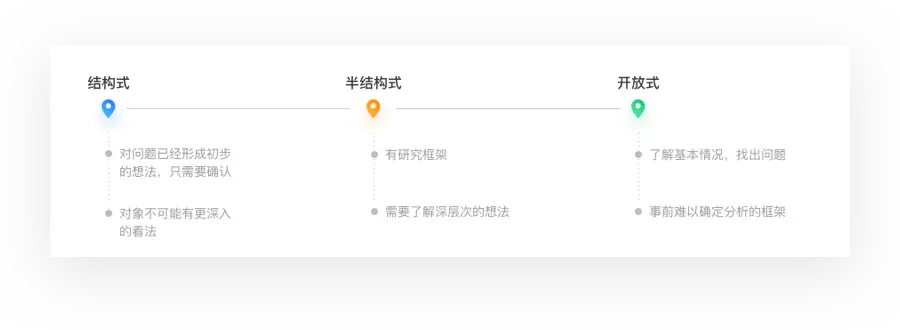 结构式:访谈员抛出事先准备好的问题让被访者回答。为了达到最好的效果,访谈员必须有一个很清晰的目标,整个过程需要引导被访者不偏离主线任务,提出的问题也需要经过仔细推敲和打磨。为了准备高质量的问题,可以列出所有问题让有经验的观察员评估,甚至可以小范围组织一波演练都是有必要的。