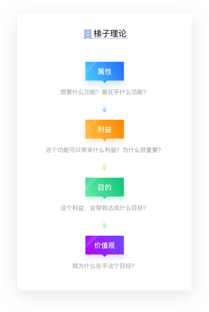 这时我们可以采用梯子理论,挖掘用户深层想法,从而证实用户说的“想要xxx功能”是否合理,或者看能否想到其他解决方案。
