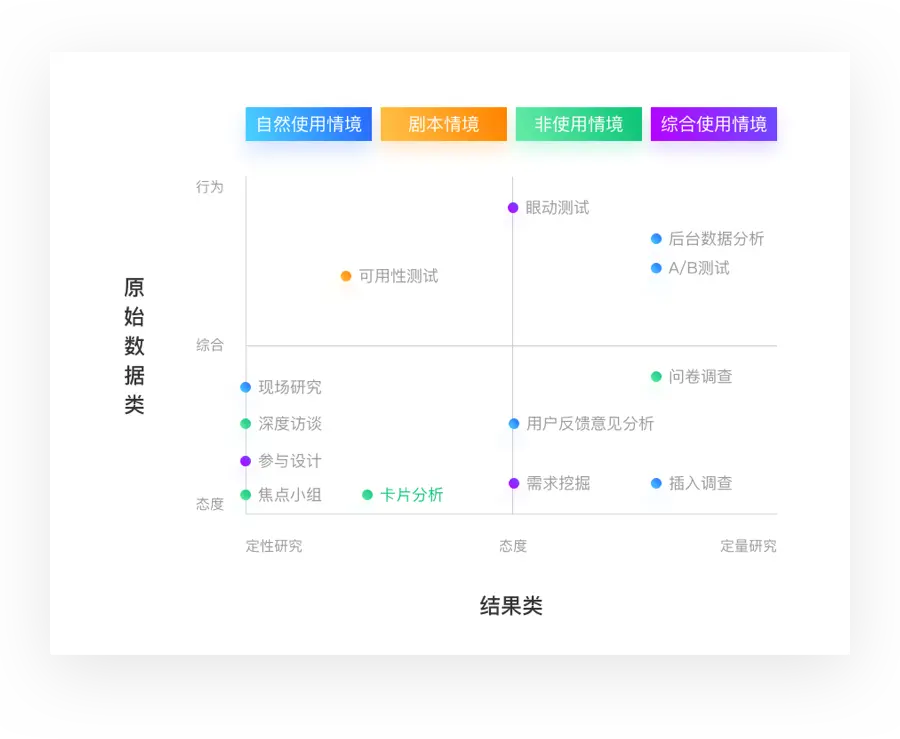用户研究的方法有很多,如何对这些方法进行选择,应该根据研究目标而定: