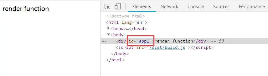 请注意上面红框框的 id, 是我们刚刚定义的 'app1'。所以我们为什么不能将元素绑定在body/html这些元素上就知道了吧,因为它会替换掉页面上的元素。