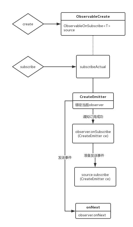 - 参数检查,然后装配Observable,返回一个ObservableCreate对象,它持有一个ObservableOnSubscribe对象,ObservableCreate是Observable的子类