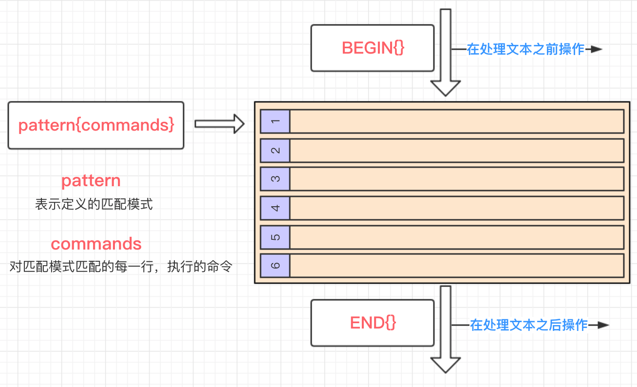 pattern{commands} 表示从文本中的第一行开始匹配满足pattern规则的行,执行commands命令,直到文本最后一行