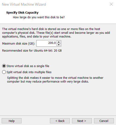6)设置虚拟机的磁盘空间,尽可能设置得大一点。虚拟机的磁盘空间是动态分配的,如这里设置了200GB,但并不会马上在主机上分配200GB的磁盘空间,如图1.4所示。