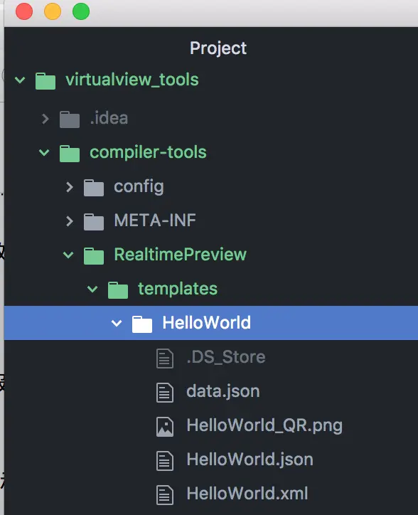 VirtualView下载后是一个工作空间 使用cocoapods pod install导入所需的库, 其中包含两个项目 一个是 RealtimePreview 其用来动态实现热更新方便调试,下面会详细介绍配合virtualview_tools使用, 另外一个是VirtualViewDemo, 其是用来演示官方提供的一些案例,在介绍动态组件的地方在内都可以找到演示demo,方便查找和学习使用,简单了解完这个工作空间(VirtualView)所包含的两个项目后,我们着重说下virtualview_tools,这个调试工具极大的方便了我们调试界面,我使用的是atom开发工具编辑此项目,打开项目 进入compiler-tools文件夹下会发现RealtimePreview和TemplateWorkSpace这两个文件,其中RealtimePreview是我们动态调试使用的 TemplateWorkSpace 是我们动态调试完打包用的,在RealtimePreview内templates文件内是我们存放模板文件的地方。