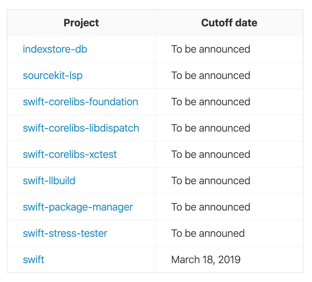 该计划的一些值得注意的例外情况见下表。每一项每天都会从 master 合并到 swift-5.1-branch。每个例外变更的最终截止日期将延长至 3 月 18 日以后,并将在稍后公布。