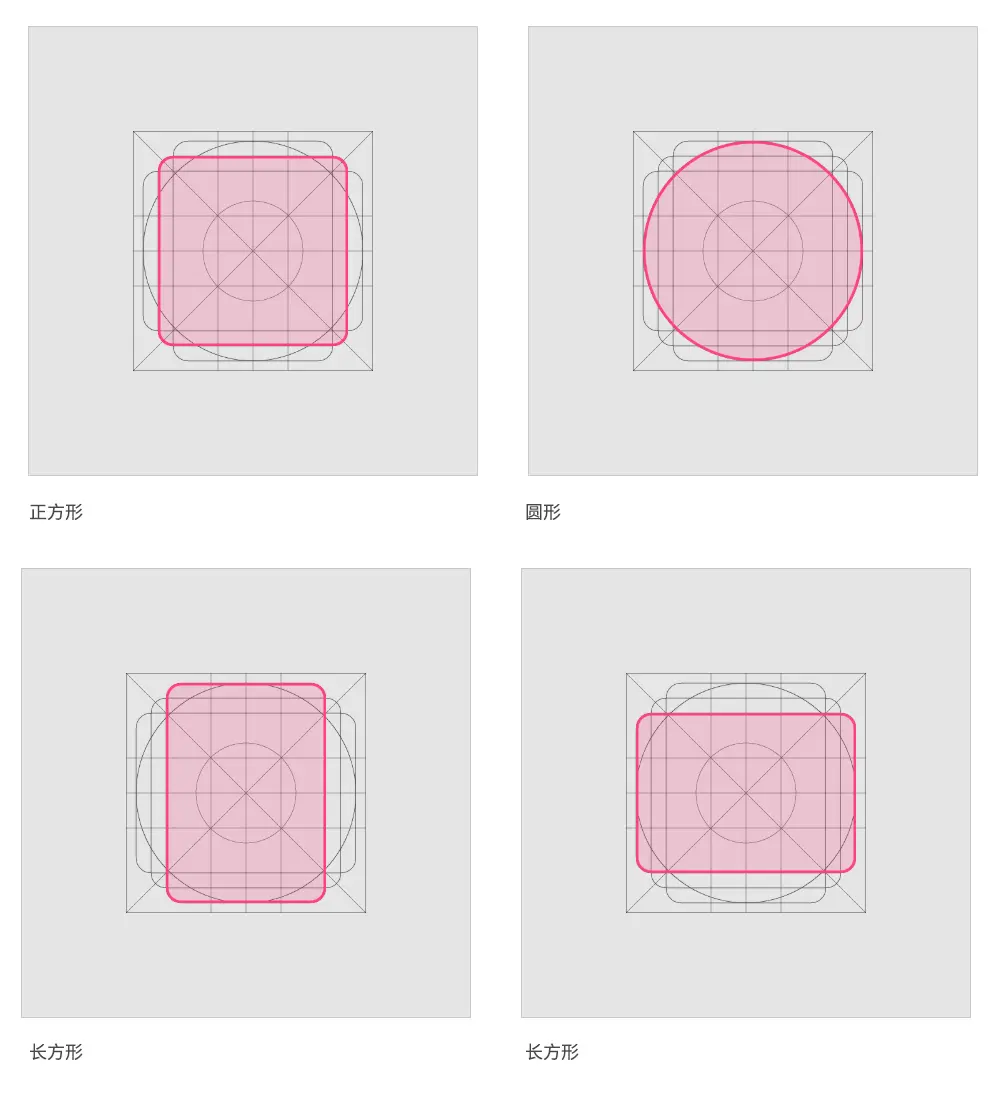 比如Material Design的参考线模板就有正方形、圆形、圆形和长方形结合等不同形式。如果对齐模板中的形状,即可得到面积相等的长方形、正方形、圆形。这对我们构建视觉上面积相等的图标很有益处。例如图(1-6)当然这只是一个工具化的参考,具体还需要根据视觉来进行微调,达到最后的大小统一。