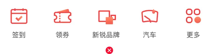 异性图标相较于圆形或圆角矩形图标,视觉表现力就稍弱,识别度略高于圆形或圆角矩形图标,但同样可用于金刚区,或者个人中心。当产品流量入口偏多,可以用两者来区分层级关系,多应用于体量较大的APP,如美团(图1-1)金刚区,业务层级更加重要的用了圆形图标,次要的用了异形图标。