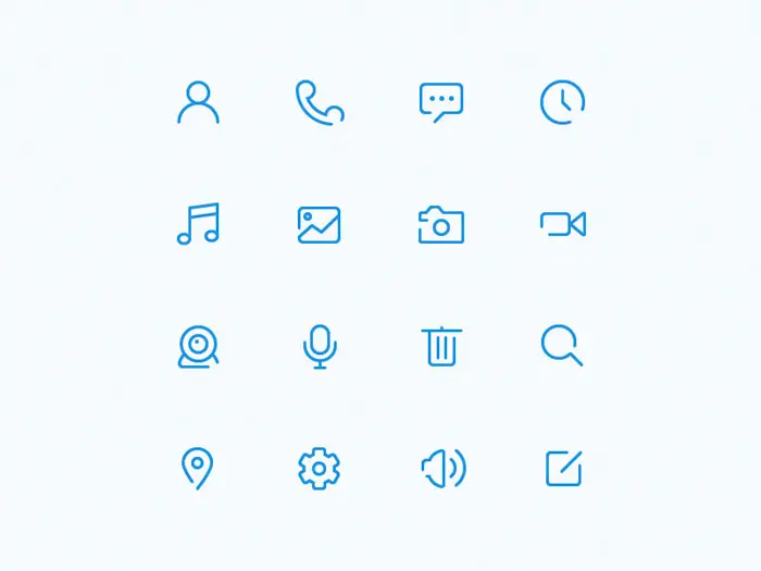 拒绝直接去素材网站下下来使用,会导致粗细不统一。线性图标粗细常见的有2px、3px、或者有更粗的5px、6px,根据自己的产品调性来决定,其中3px是最常见的,微信最新的7.0版本,标签栏从2px都加粗到3px,其他icon也都相应加粗,所以3px已经成为主流。细线显得精致,粗线视觉面积大,显得厚重敦实。所以保证线条粗细统一是图标设计最基本的要求,如图(1-9)