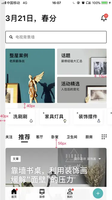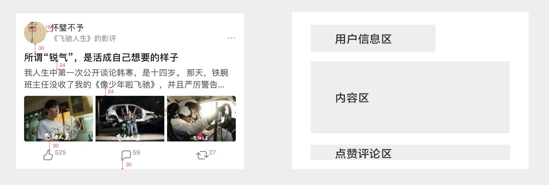 豆瓣内容推荐如图(2-5)卡片信息,主要分为三个层级:用户信息区、内容区、点赞评论区。所以这三个区域之间的间距是最大的,都是统一的30px,内容区依次是标题、文案和图片,关联性强于三大区,所以间距用了24px;然后用户信息区的头像和用户名信息关联较大,所以用了16px间距。三张图片关联性是最大的,所以用了8px最小间距。