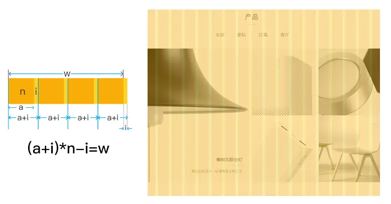 我们定义为:每一列宽度为a,间距为i,列数为n,总宽度为w,计算公式则为(a+i)*n-i=w。
