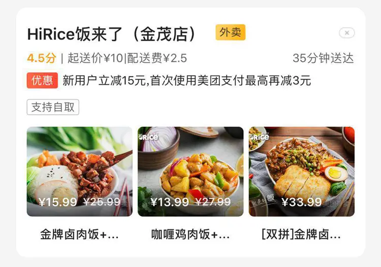 界面设计中的颜色对比,多用于产品标签或交互按钮上。如图美团卡片推荐(2-3)促销信息、评分还有商家属性的标签都做了不同颜色的区分。促销信息用了红色刺激购买欲,外卖标签用了美团外卖的产品色黄色,更具有品牌标识。并与促销信息区分开来。