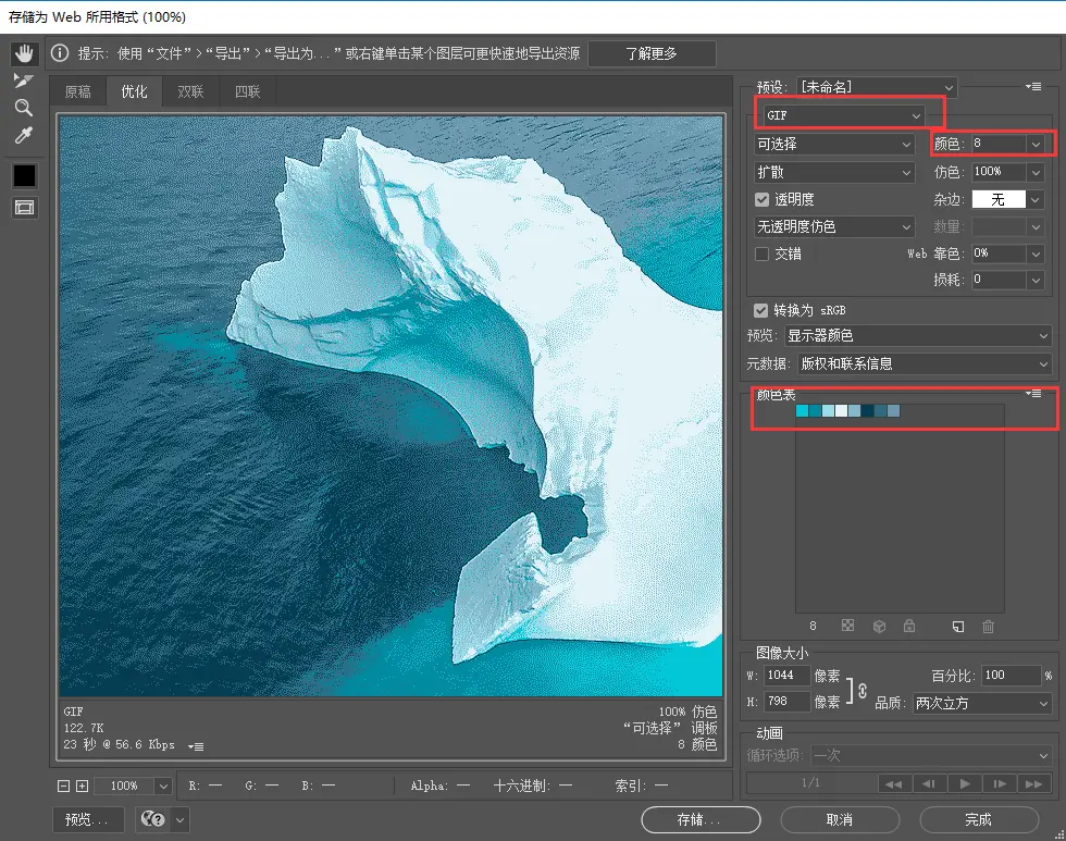 有很多摄影作品的色彩都非常好看,从摄影作品中提取颜色也是一个不错的方法。Photoshop打开图片 → 存储为Web所用格式→ 选择GIF格式 → 颜色选择 8 → 颜色表中双击色块 → 拾色器。如图(3-6)