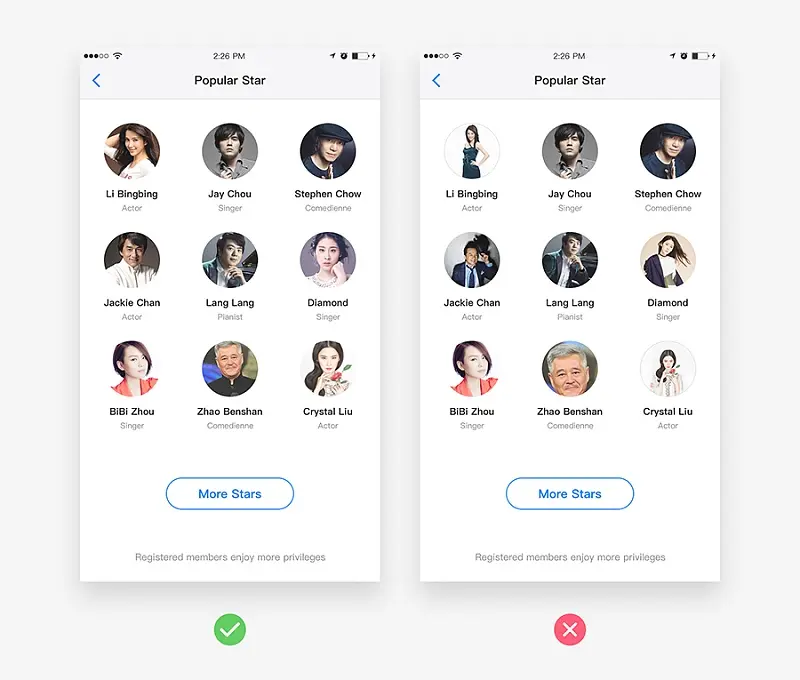 图片的构图比例也必须要一致,在做同一板块的时候要保持图片构图比例一致性。如在做在人物展示的设计中,如果并列出现多个人物形象,为了保持视觉平衡我们需要调整并列图片的大小比例,就像所有角色都是在相同焦距下拍摄的。在人物上下位置的调整上面我们要尽量控制视平线的方向,让他们的眼睛处于相同的位置左右。如图(4-5)