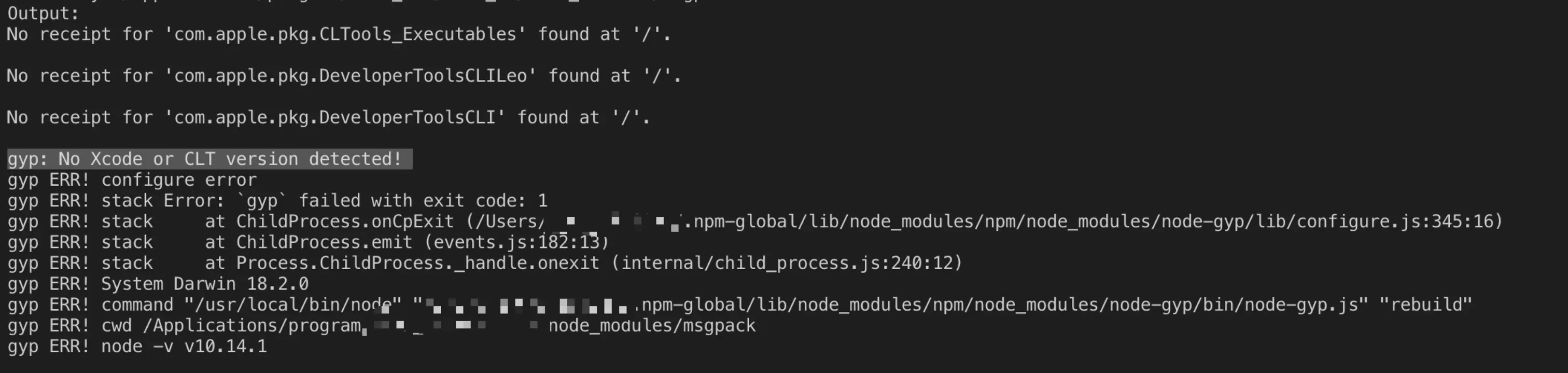 gyp: No Xcode or CLT version detected! Daibai 2019-02-25 5,692 阅读1分钟 最近项目在安装依赖的时候,报如下错误:原因是Mac升级后,缺了xcode 的CLI 工具, 只要执行下面的命令来安装就可以了。sudo xcode-select --install
