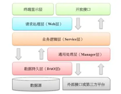 后端工程师是幸运的,Spring这个元老级的框架已经为他们铺设好了大量的基础设施,像是依赖注入、面向切片编程以及大量优质注解和上层封装接口。同时,社区也总结出了如下图的业务逻辑分层: