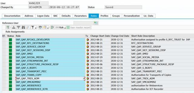 然后在事务码SU01里将多个角色分配给用户: