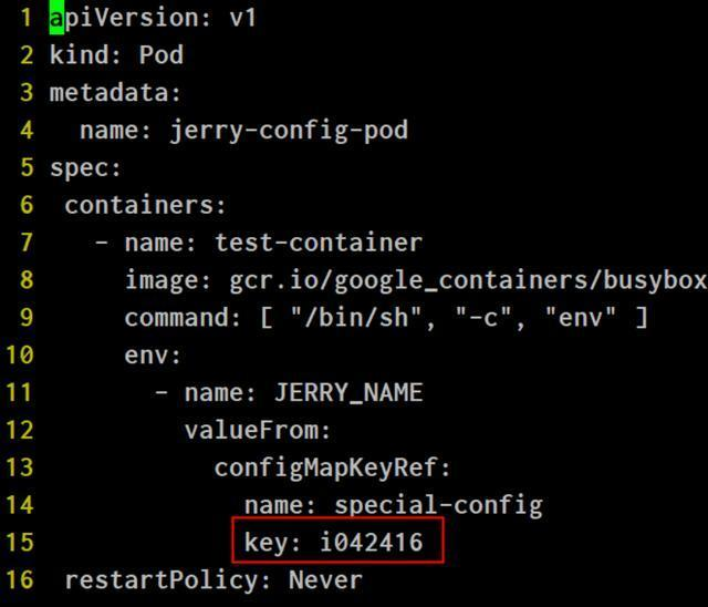可以看到第15行引用了我的ConfigMap的key:i042416