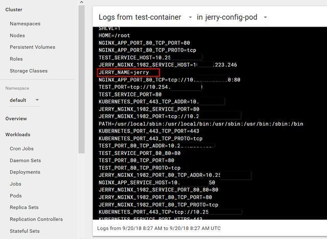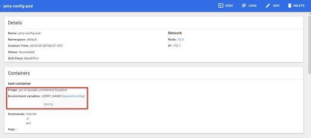 因为我yaml文件里指定pod执行的script为/bin/sh -c env, 因此最后会将容器里所有的环境变量都打印出来,我们定义在ConfigMap里的i042416的值jerry也被显示了出来: