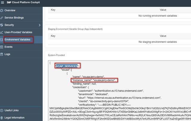 在运行时这个XSUAA的id会被SAP云平台自动写入环境变量VCAP_SERVICES里: