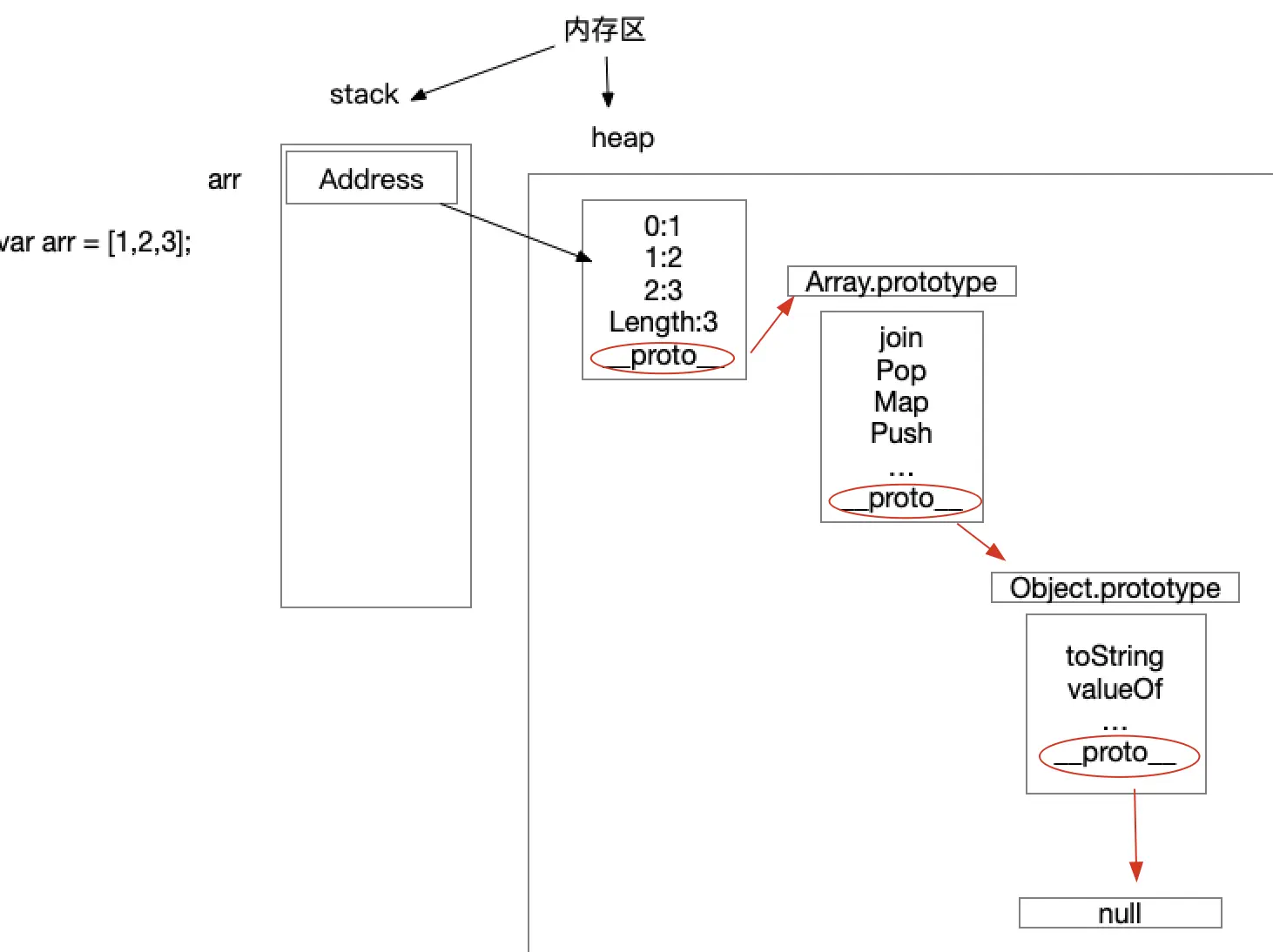 var arr = [1,2]; // 内存中 __proto__, 指向的是Array.prototype