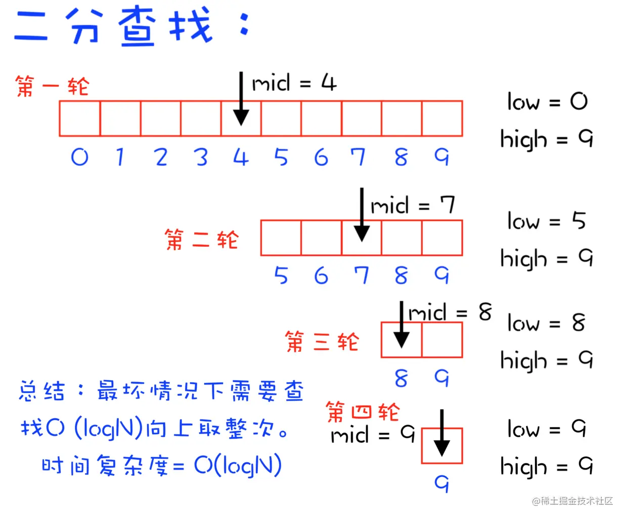 二分查找,顾名思义,每次查找将数组分成两部分,从中间开始找。