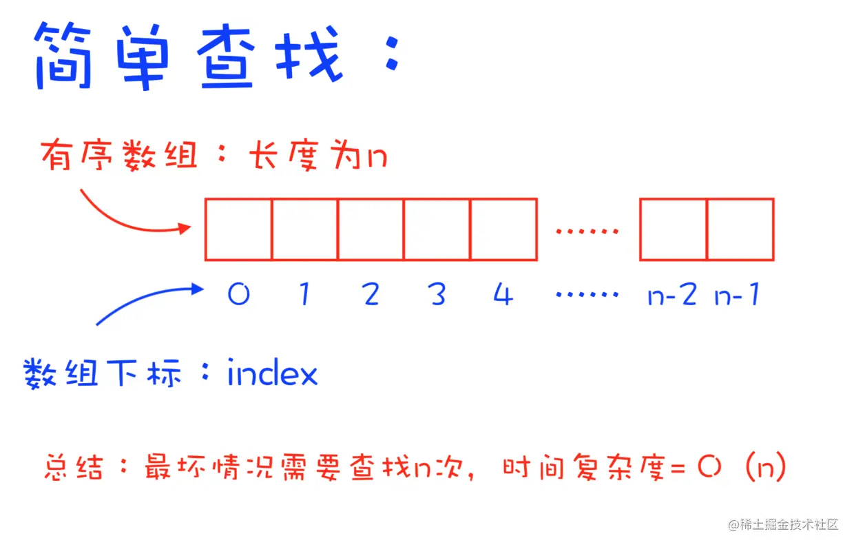 先介绍一个简单而暴力的查找方式:直接遍历一遍这个数组,找到对应的数后再返回index。这个方法我们称之为——简单查找。