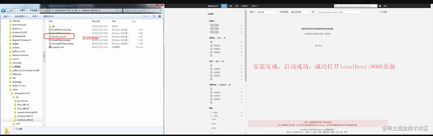 - 下载完直接解压 SonarQube 就好,进入sonar/bin目录下,进入对应的系统目录,启动 sonar,再用浏览器打开,输入URL:localhost:9000,如果可以看到后台界面说明安装成功。