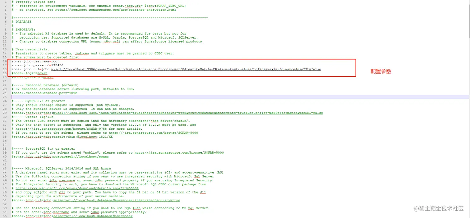 (2) 修改 Sonar 配置,找到安装包下conf/sonar.properties文件,去掉sonar.jdbc.username、sonar.jdbc.password、sonar.jdbc.url前面的注释符号,再填写具体的username、password和url: