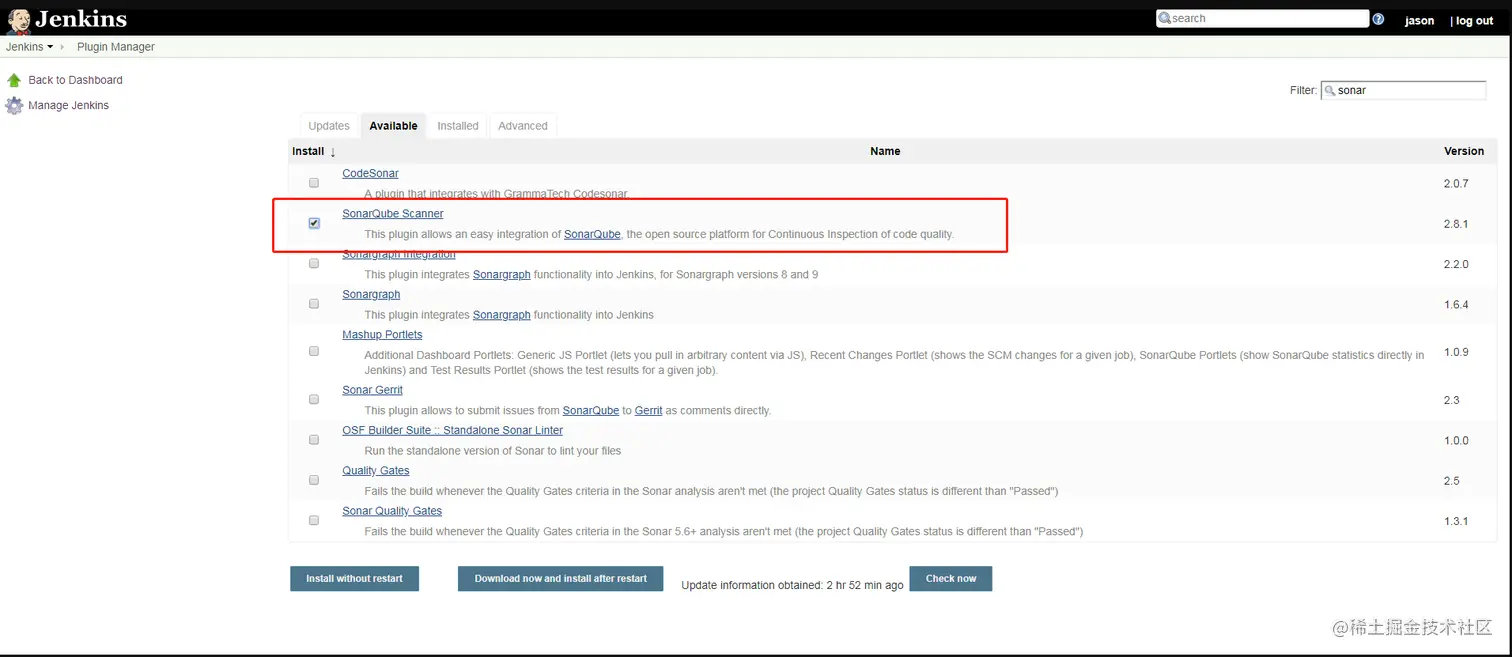 - (1) 安装 jenkins 插件 SonarQube Scanner For Jenkins