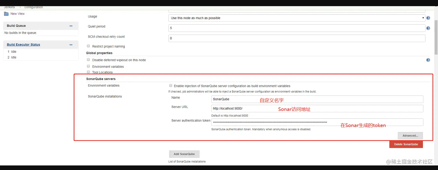 - (2) 配置 sonar 服务,Manage Jenkins > Configure System > SonarQube servers,并添加sonar token