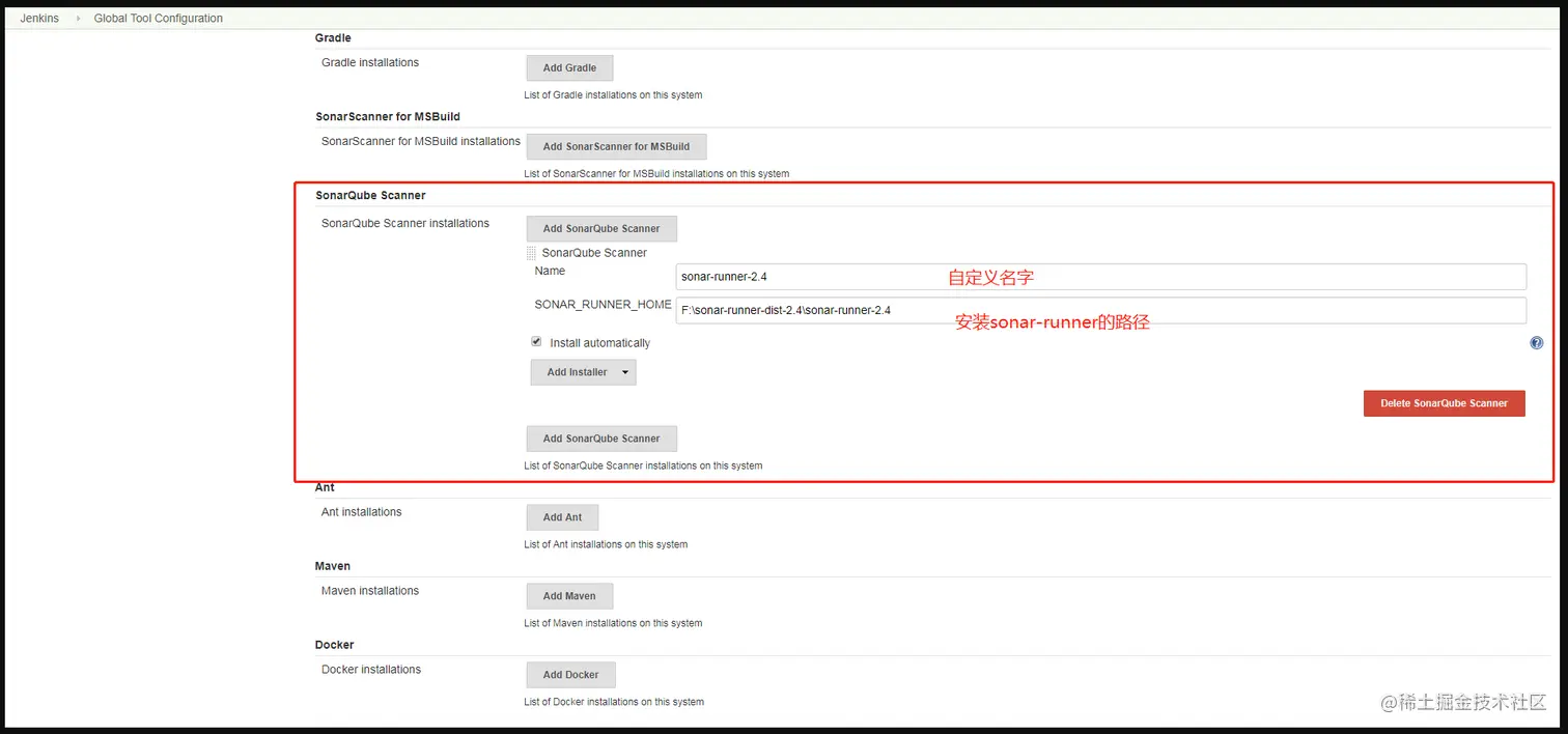 - (3) 设置 sonar 安装路径,Manage Jenkins > Global Tool Configuration