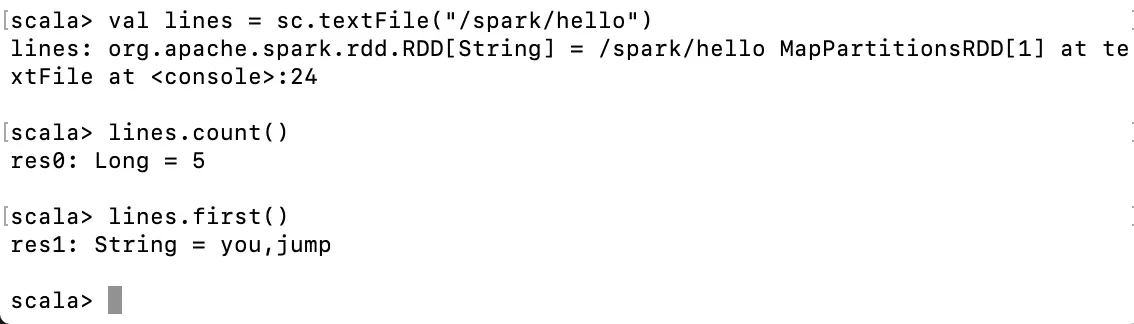 以上这条命令,就把spark目录下hello文件装载到sc当中,但事实上,由于spark的懒加载,此时的文件只有在被操作时才会真正被读取,即lines.count()和lines.first()被执行时,才回去读取内容